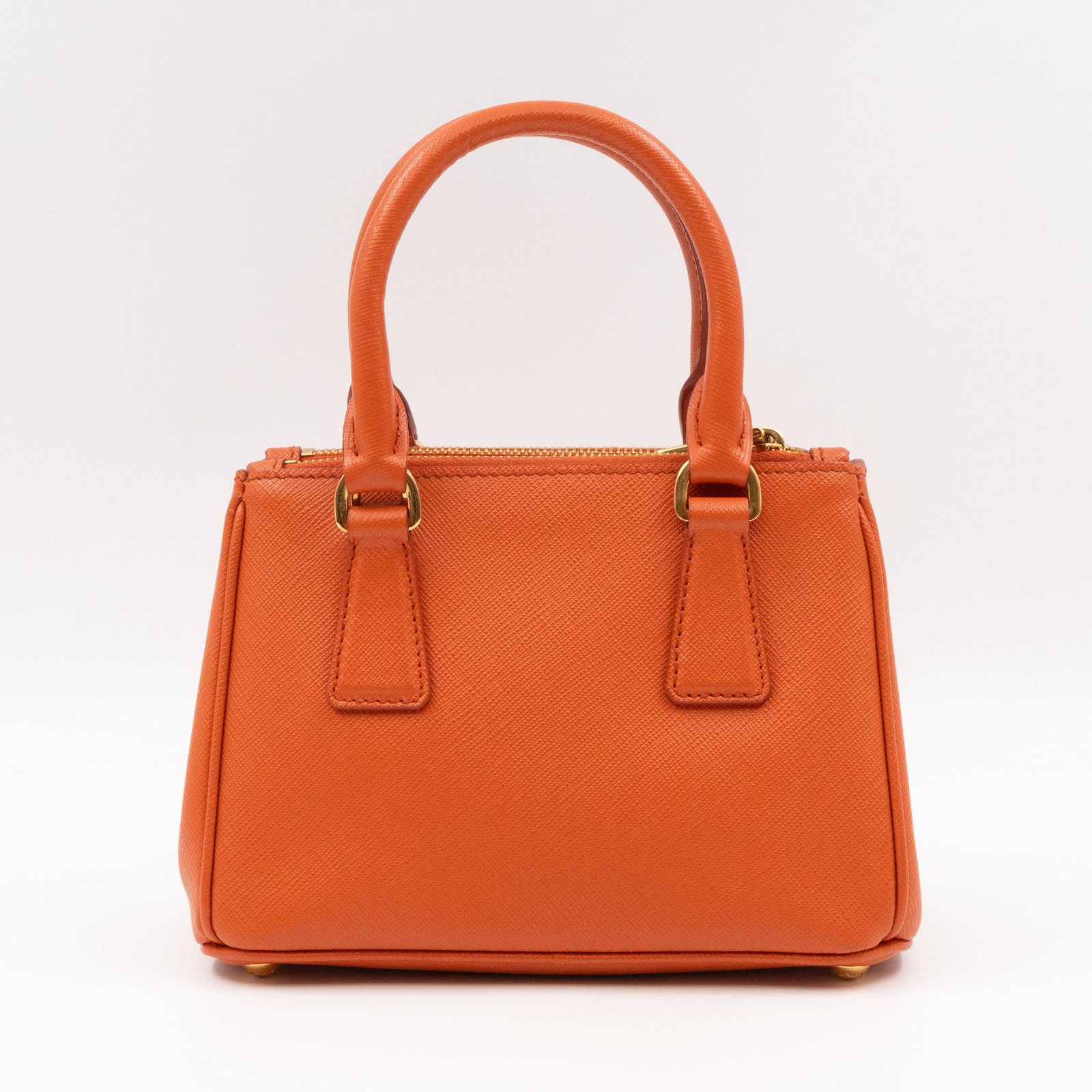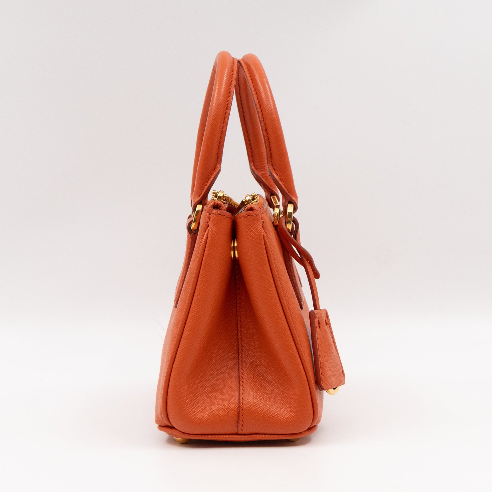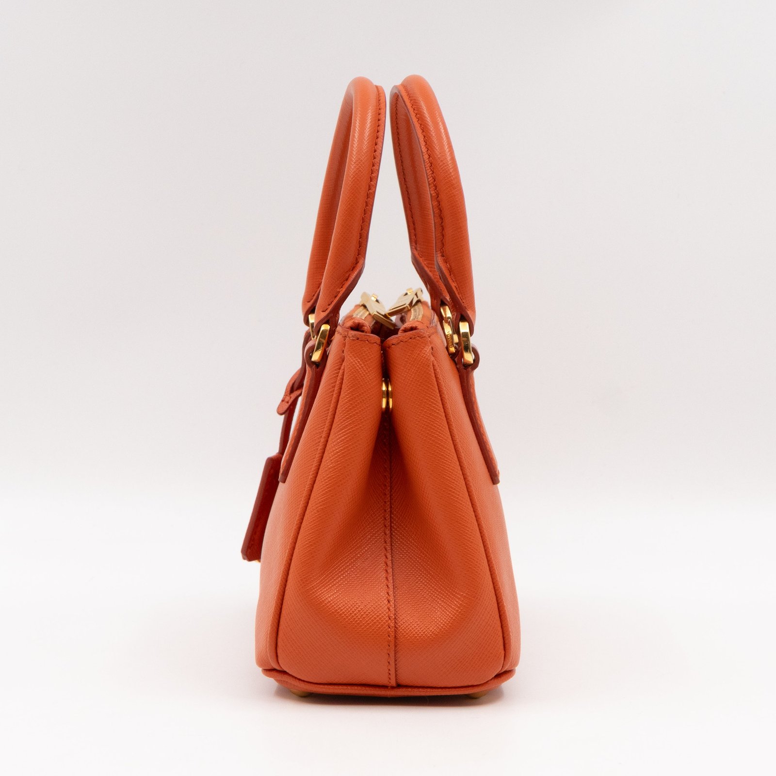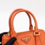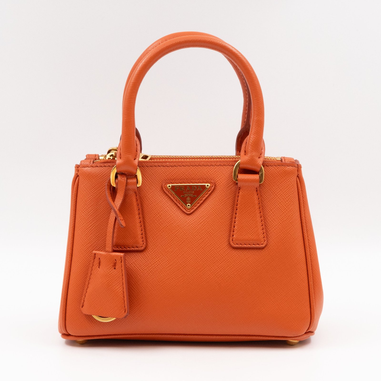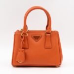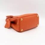 A cute micro sized edition Prada Galleria Micro Double Zip bag. Made with Saffiano leather in orange, combined with gold-tone hardware. This miniature Galleria fits your phone, and wallet, with other small items. Each side has zipper pockets, the middle compartment expands to a more spacious size. Current retail price over €3200.