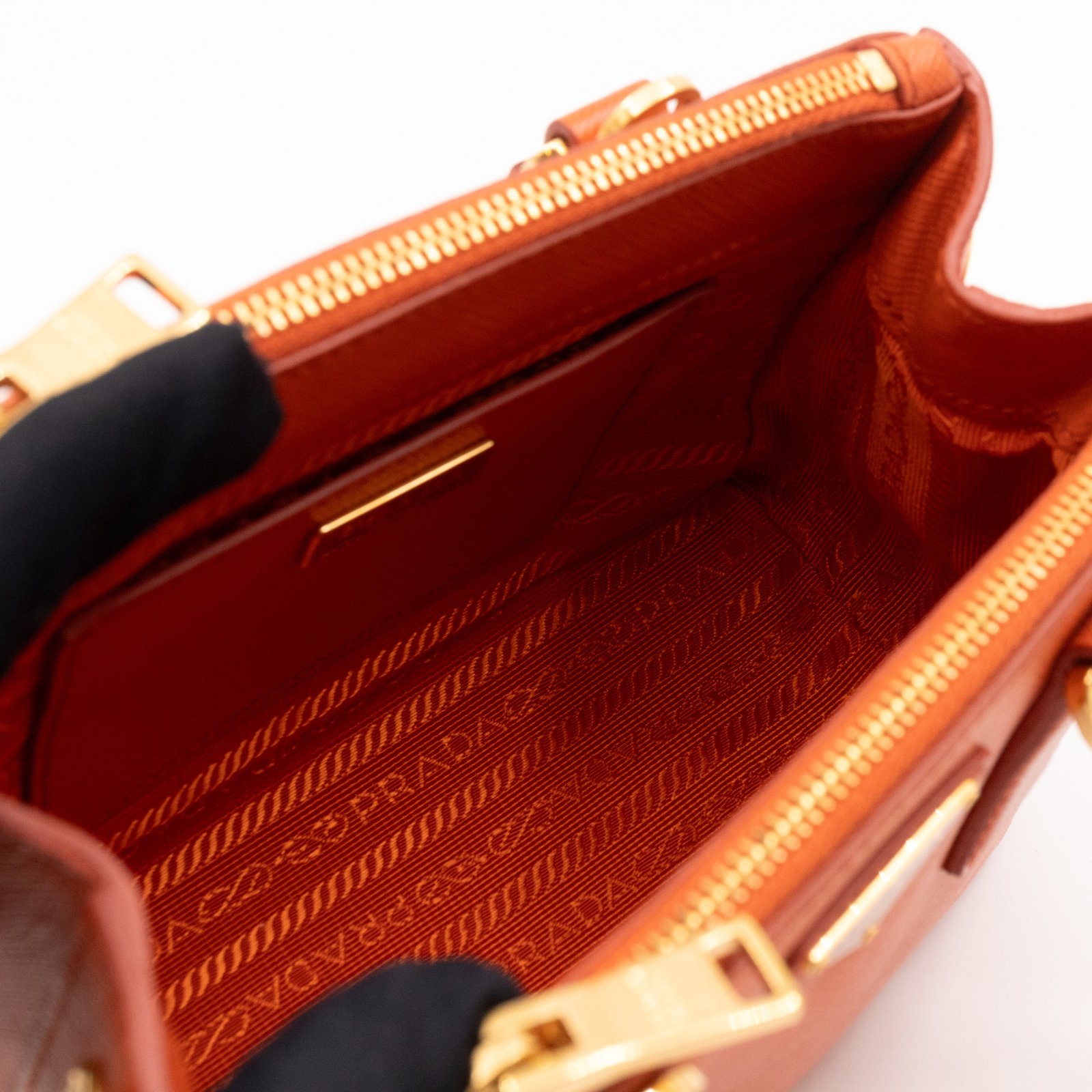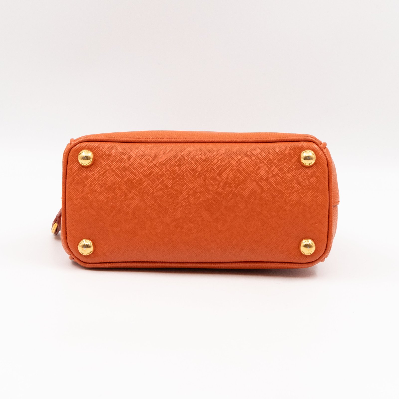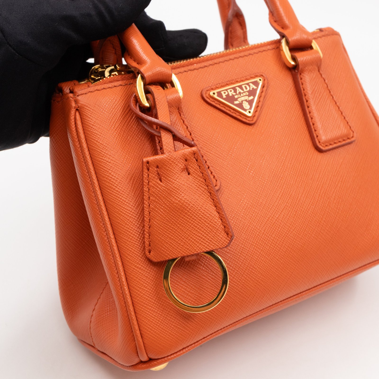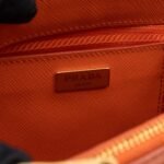 A cute micro sized edition Prada Galleria Micro Double Zip bag. Made with Saffiano leather in orange, combined with gold-tone hardware. This miniature Galleria fits your phone, and wallet, with other small items. Each side has zipper pockets, the middle compartment expands to a more spacious size. Current retail price over €3200.