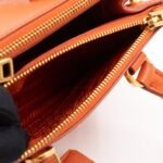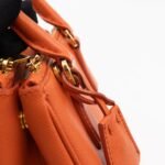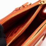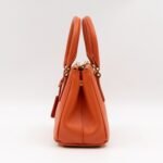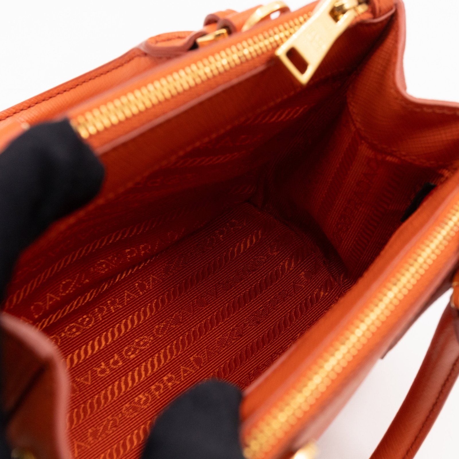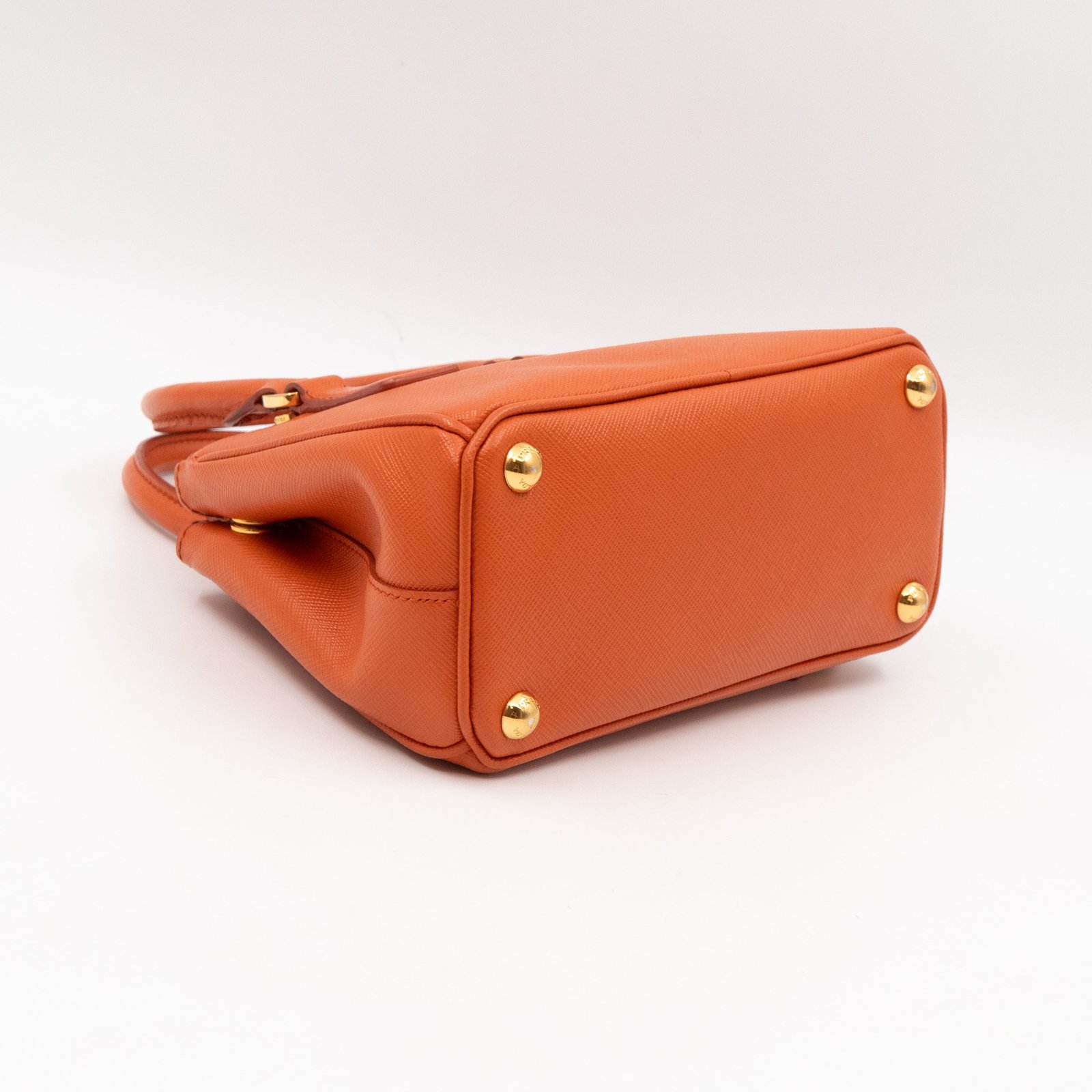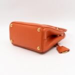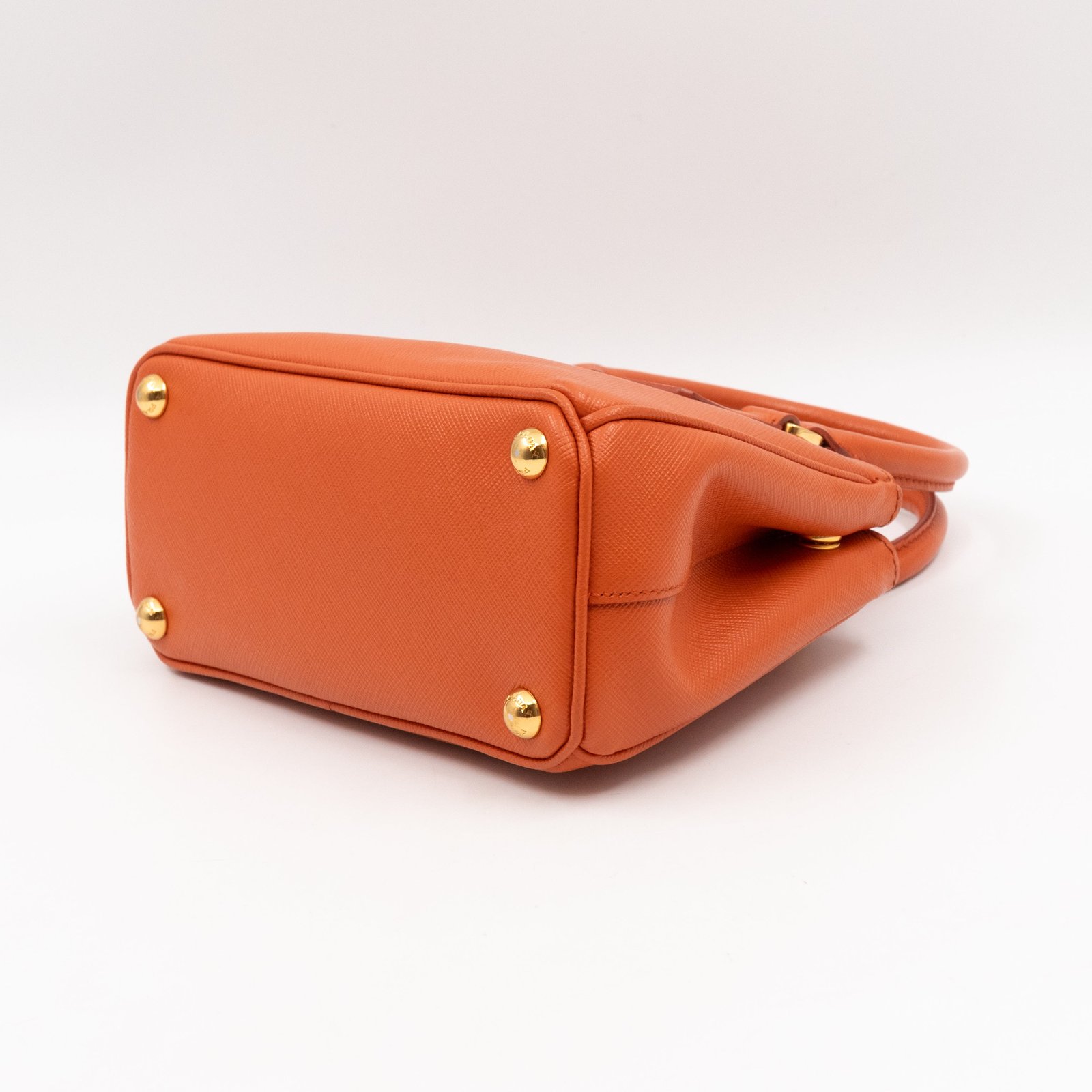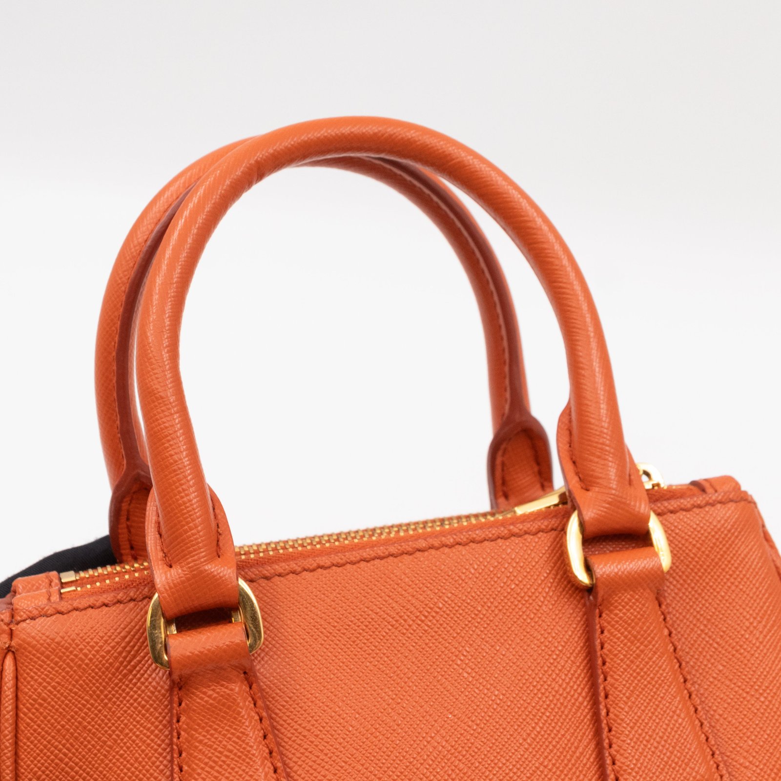 A cute micro sized edition Prada Galleria Micro Double Zip bag. Made with Saffiano leather in orange, combined with gold-tone hardware. This miniature Galleria fits your phone, and wallet, with other small items. Each side has zipper pockets, the middle compartment expands to a more spacious size. Current retail price over €3200.