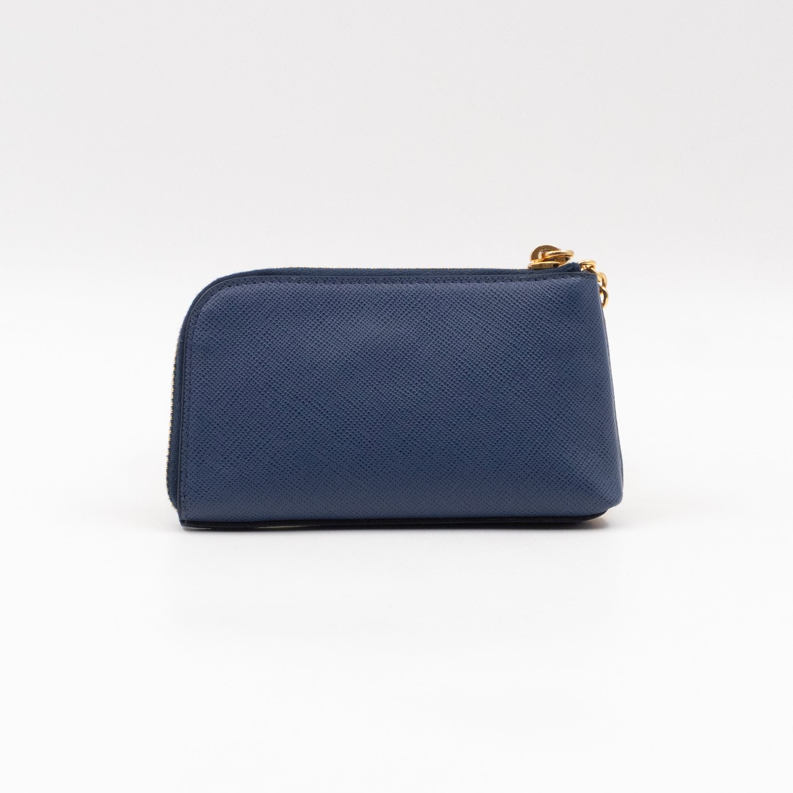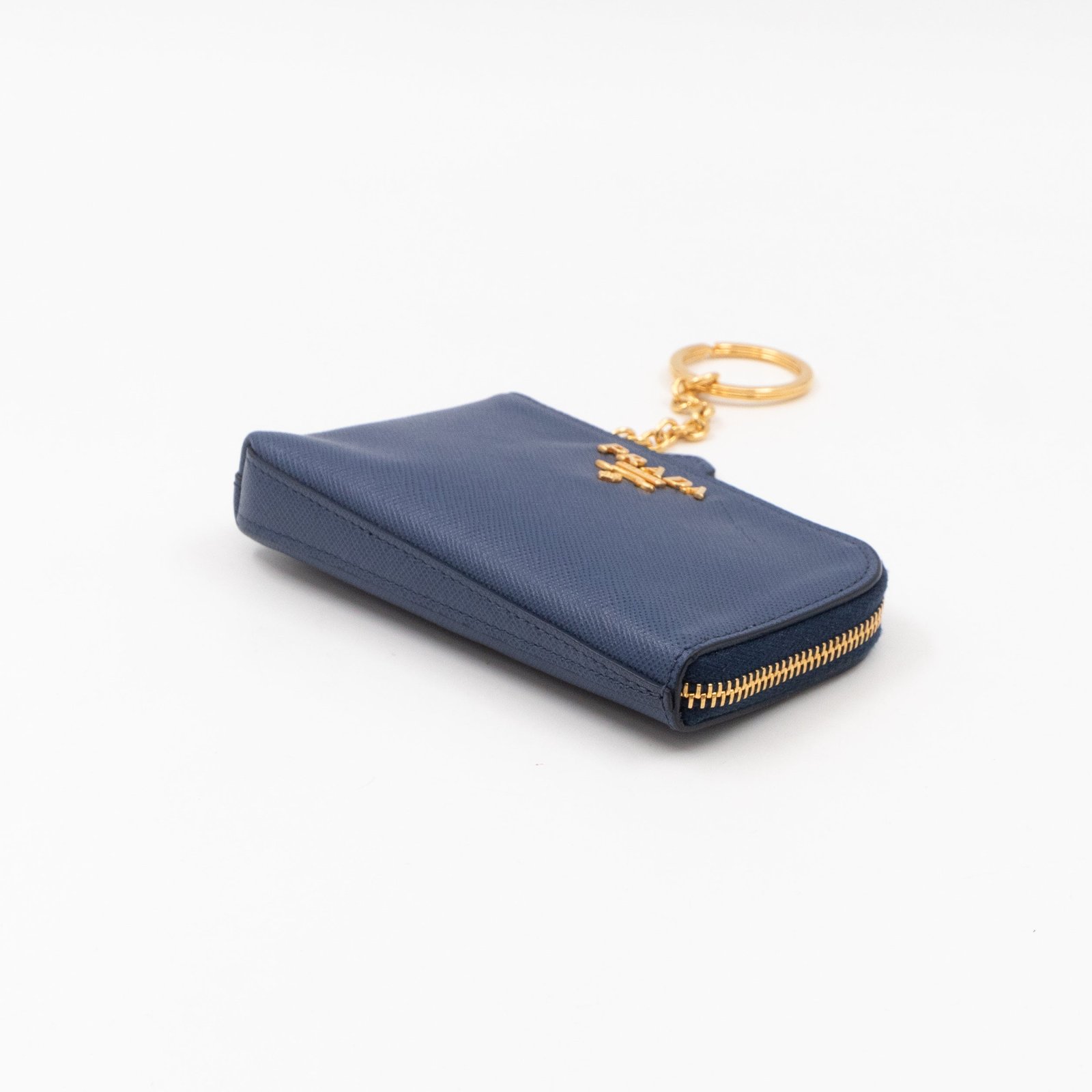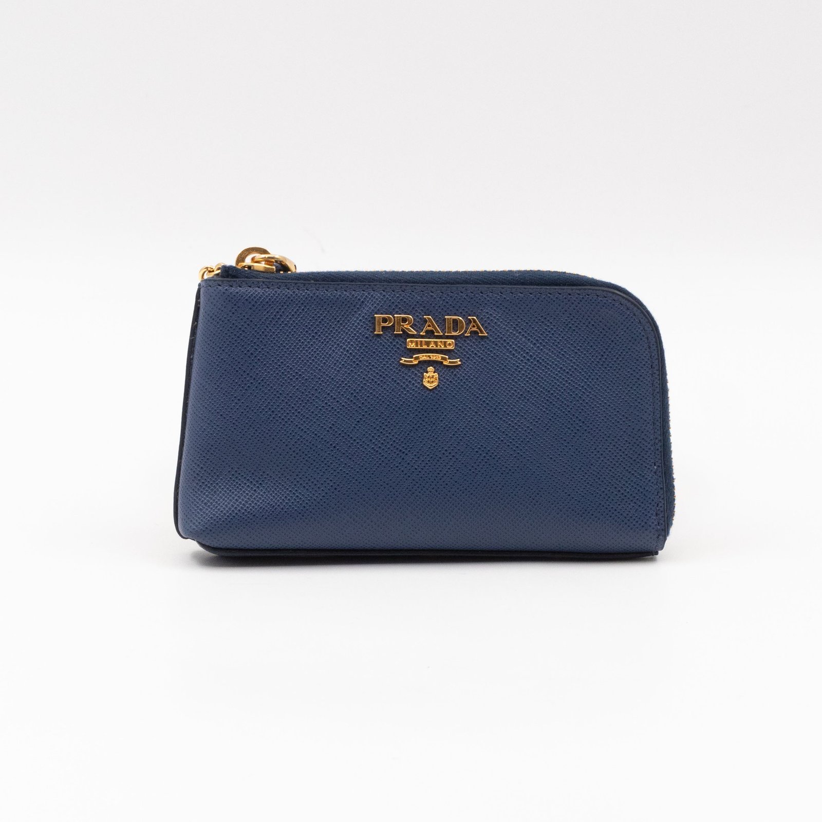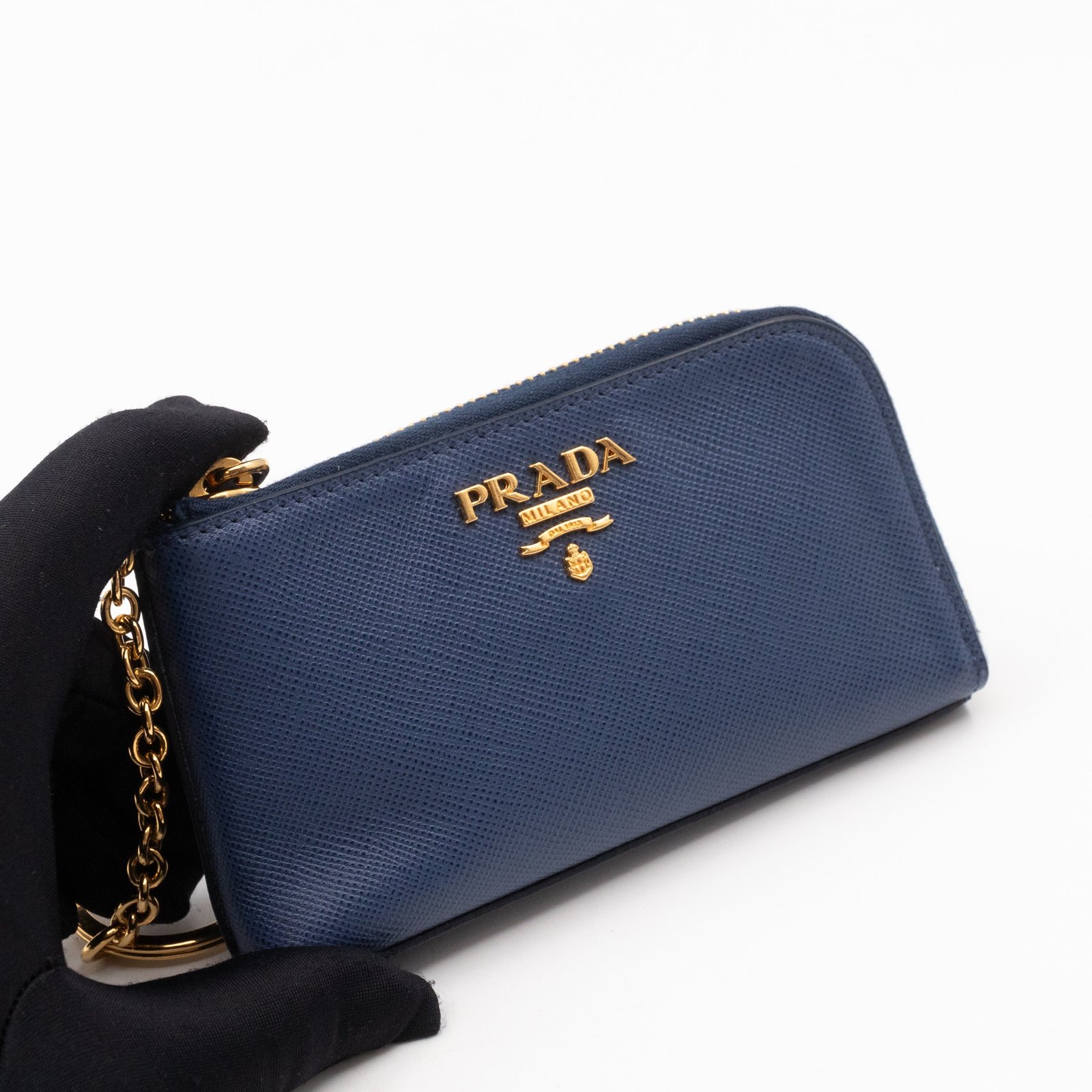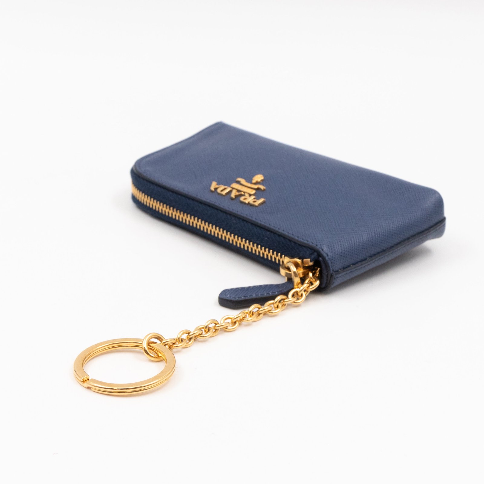 A practical mini Key Pouch from Prada. This everyday accessory is made with blue saffiano leather, it has zipper closure and a key ring on chain inside. Attach it your bag or keep it in your pocket. It fits keys, coins and even bank cards.Â