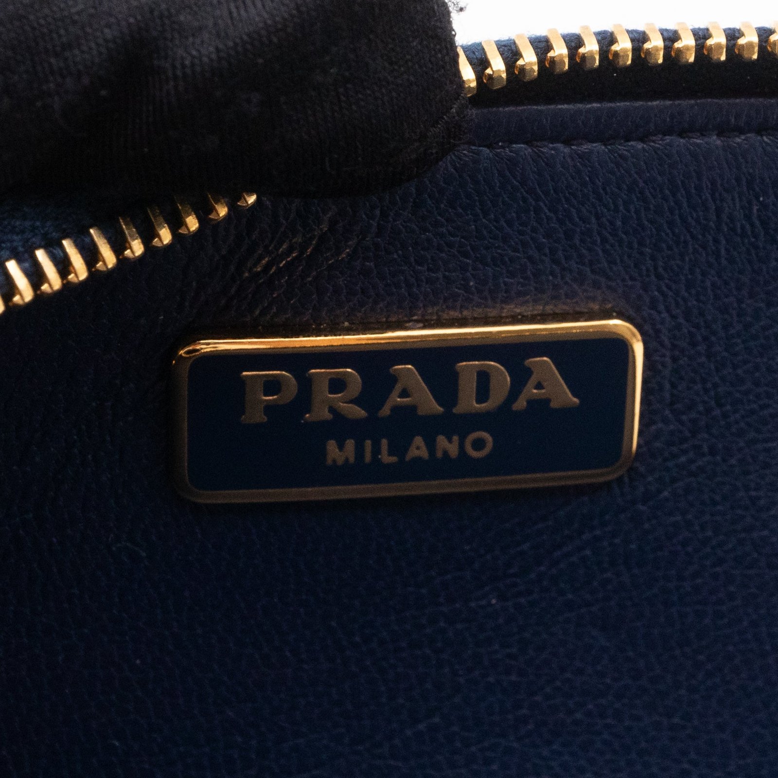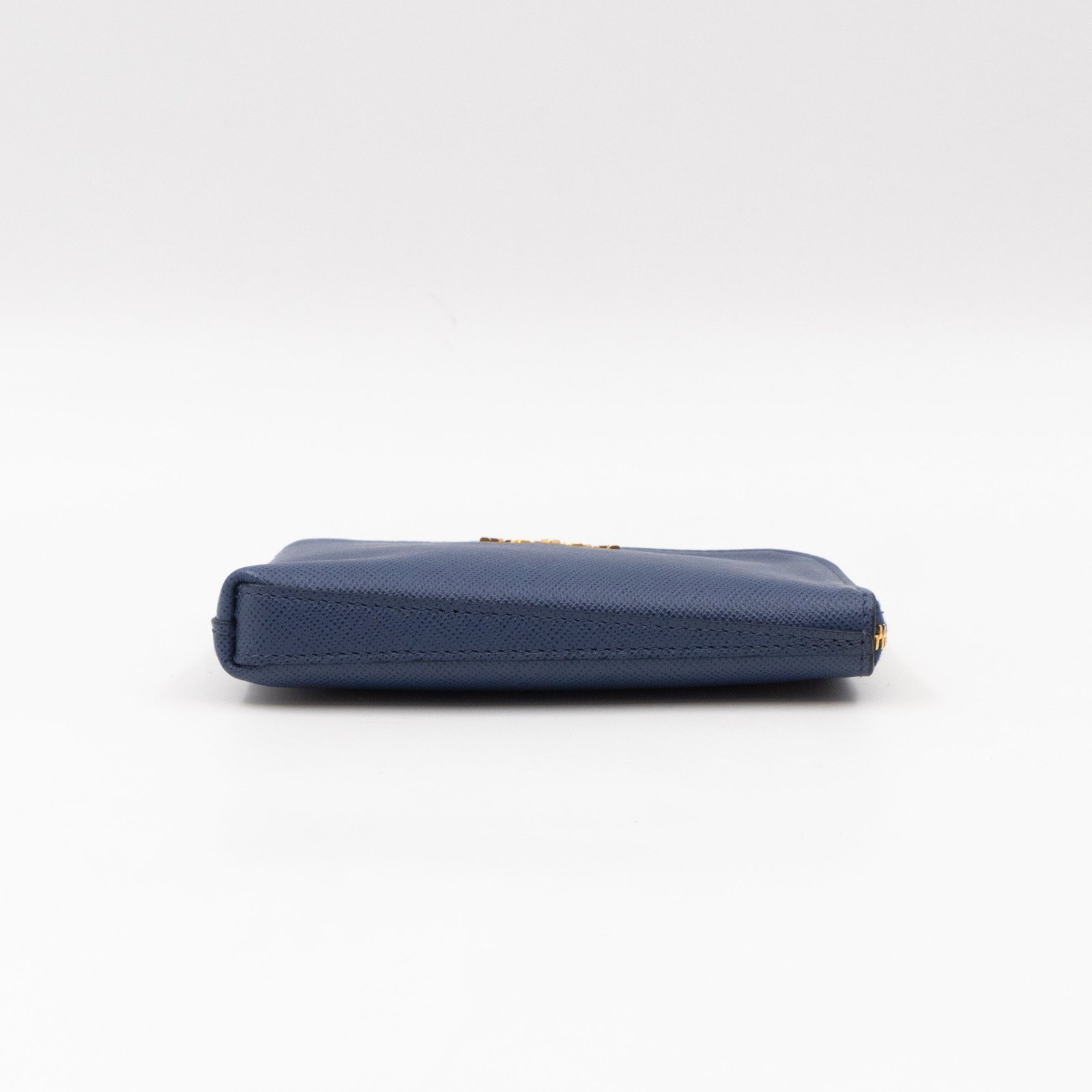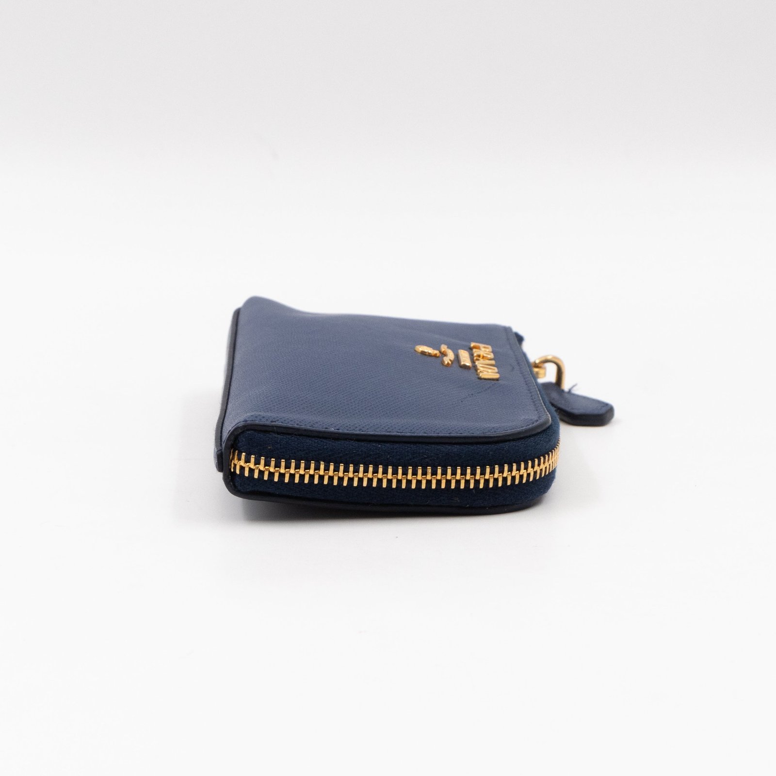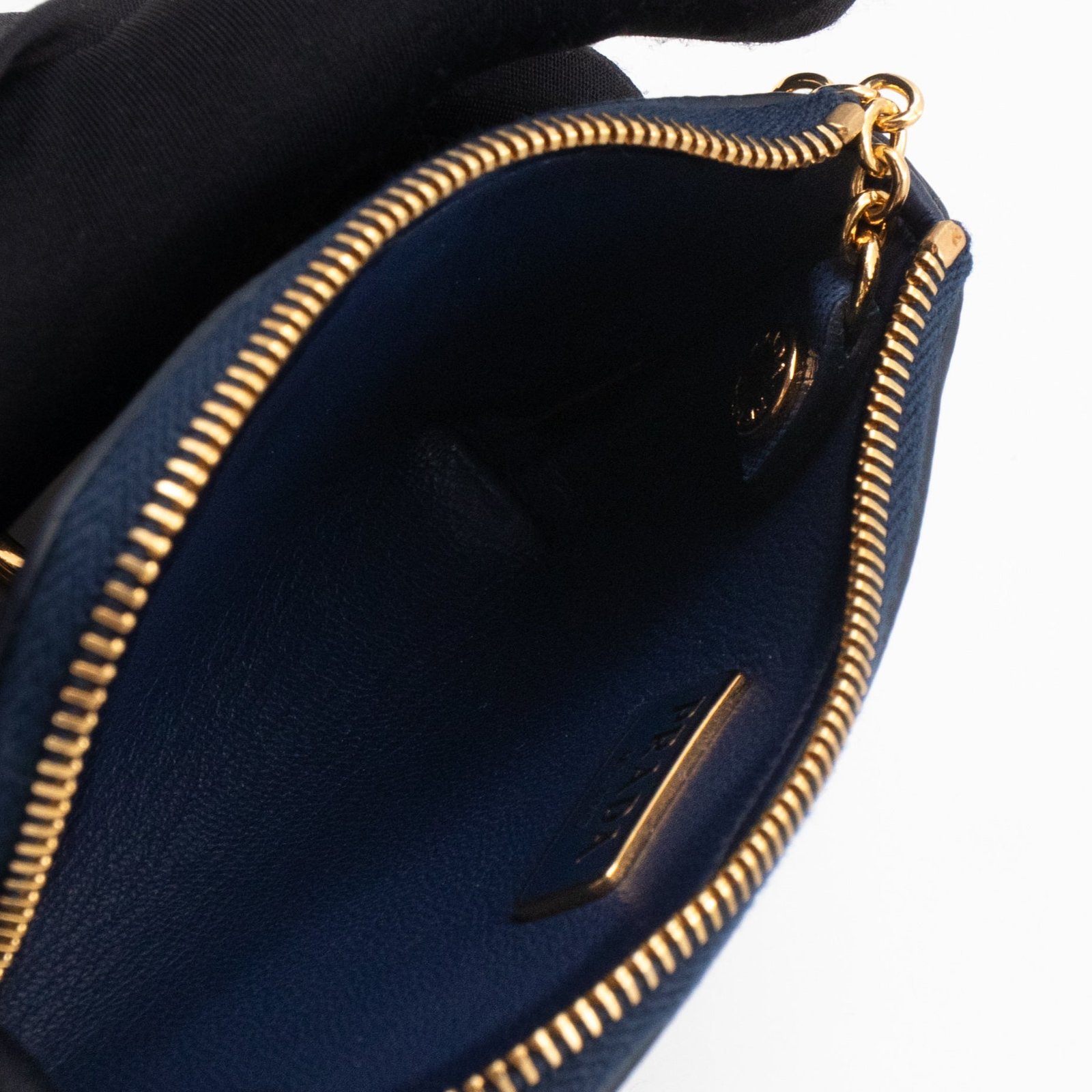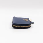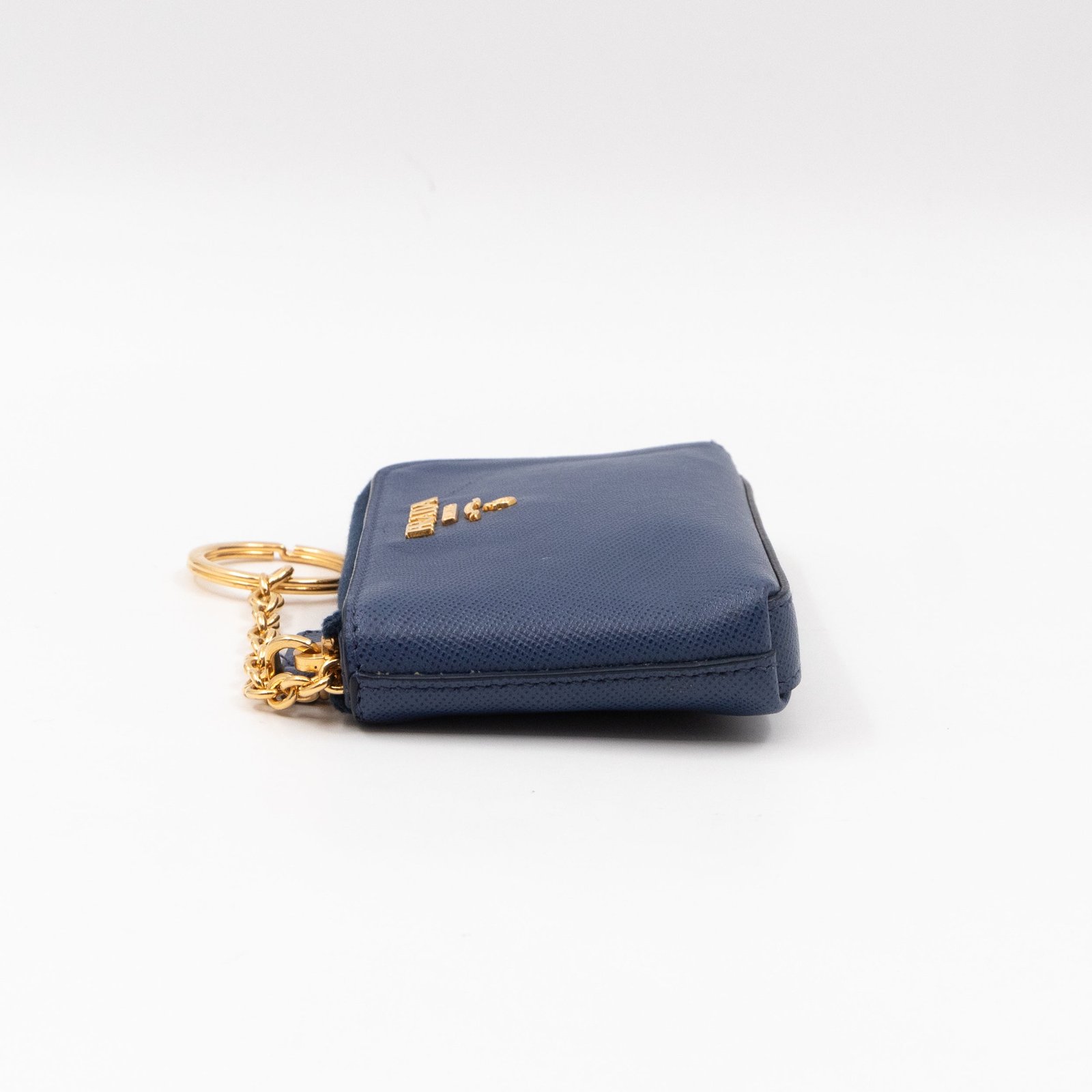 A practical mini Key Pouch from Prada. This everyday accessory is made with blue saffiano leather, it has zipper closure and a key ring on chain inside. Attach it your bag or keep it in your pocket. It fits keys, coins and even bank cards.Â