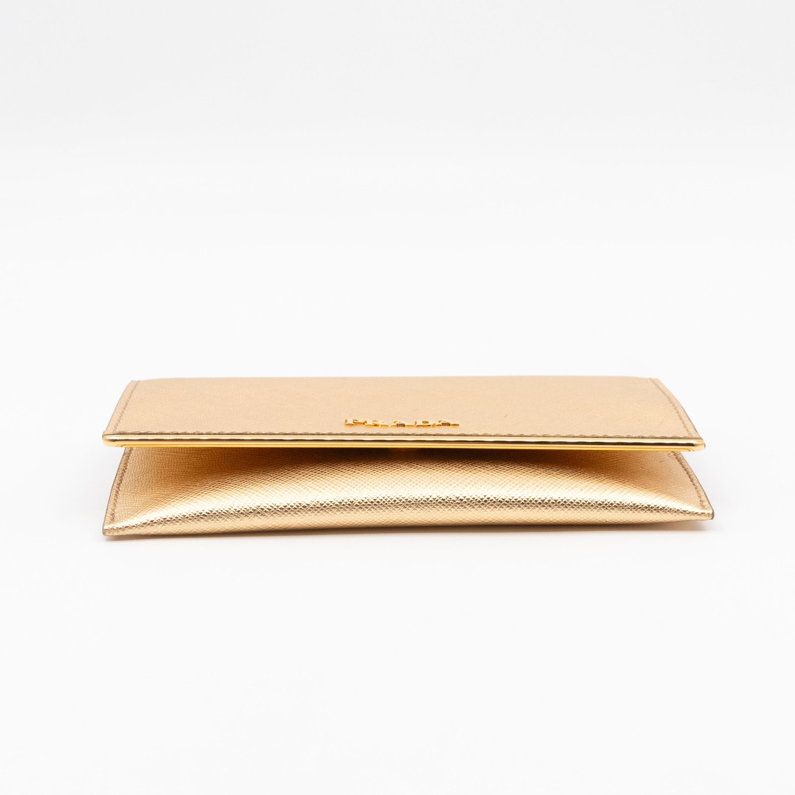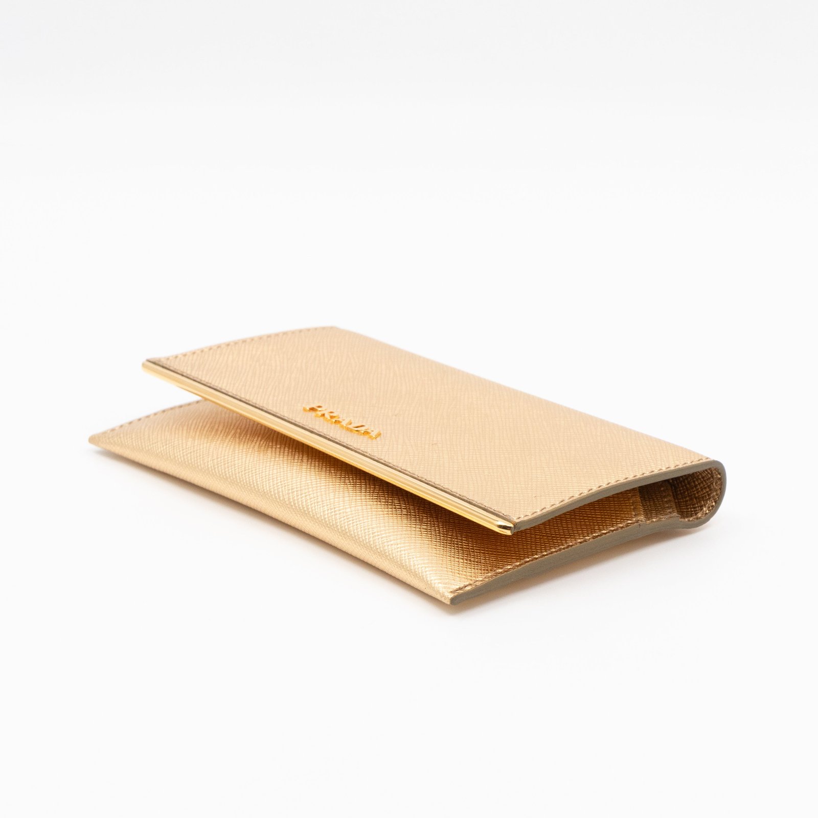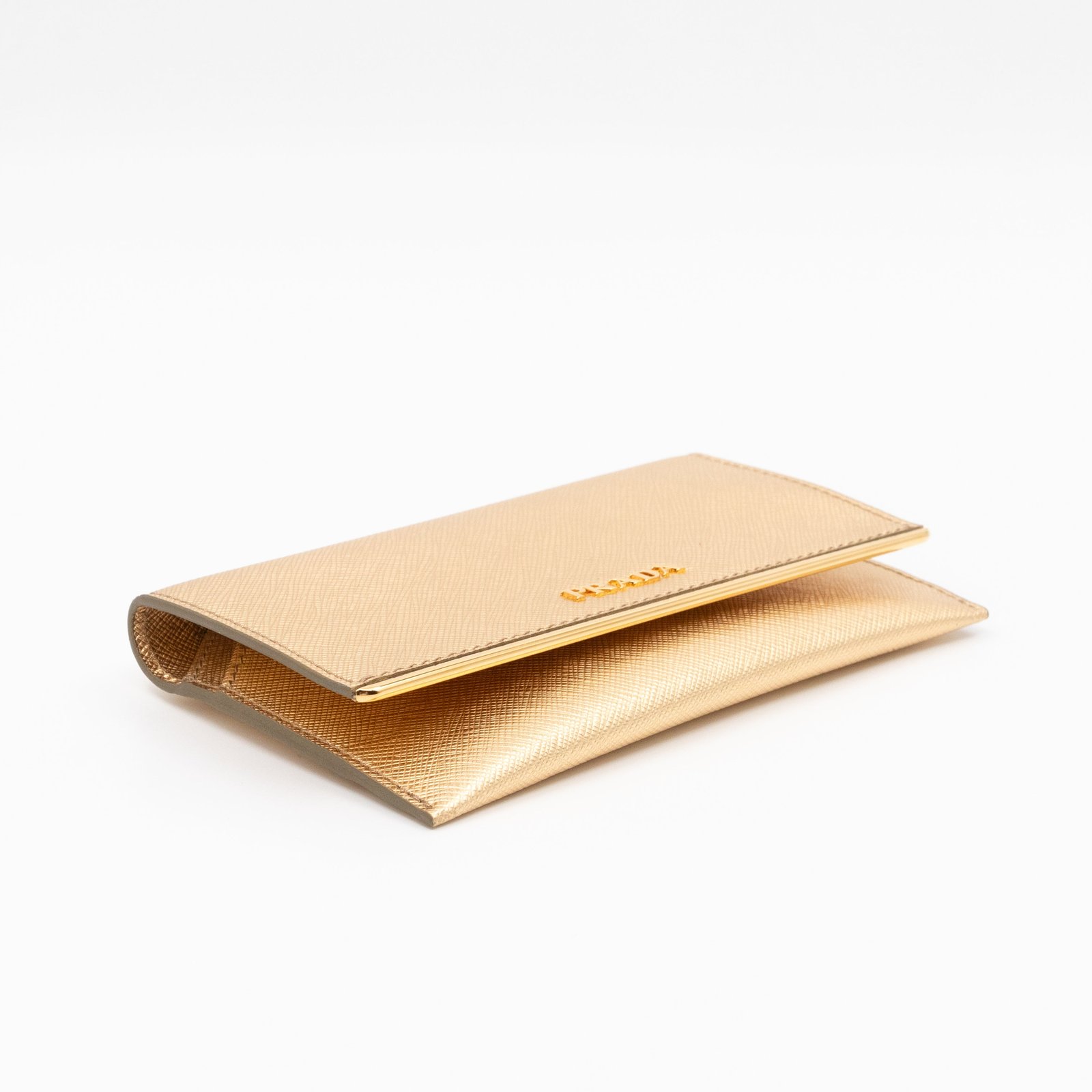 A Metal Saffiano Wallet from Prada. This everyday accessory is made with gold mental color saffiano shine leather and gold-tone hardware. Opens to matching gold leather with an independent card holder and two patch pockets, perfect for organizing small items, providing both style and practicality.