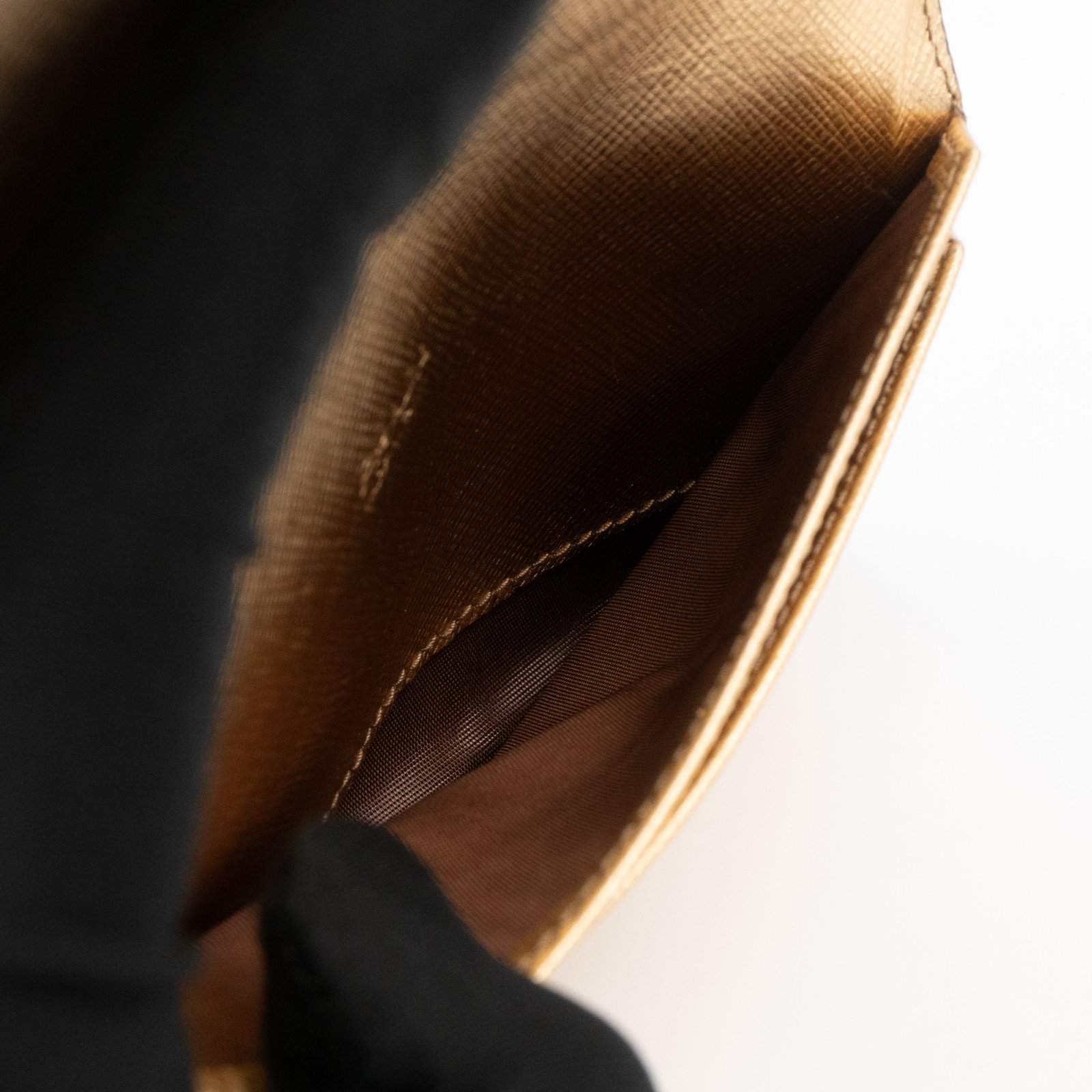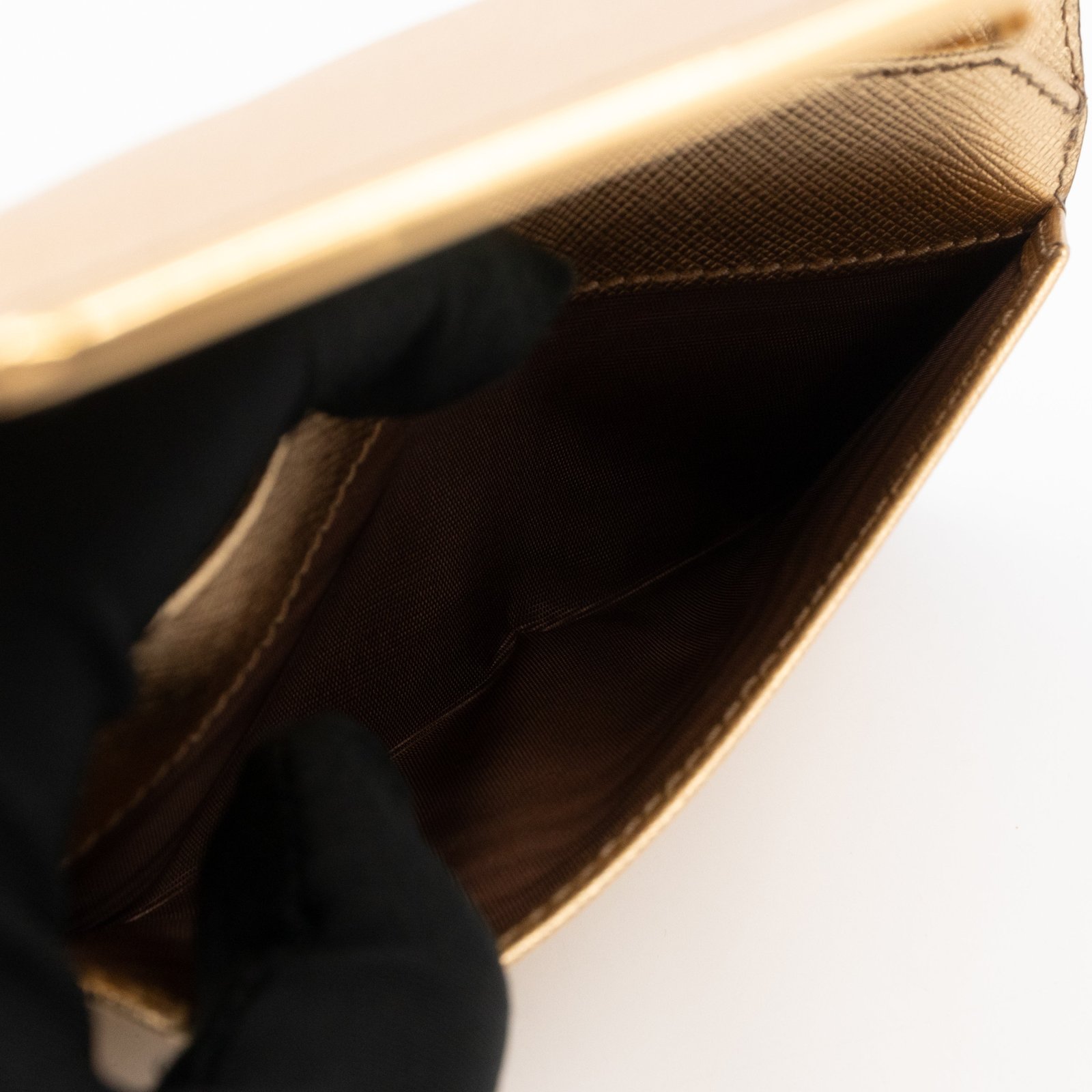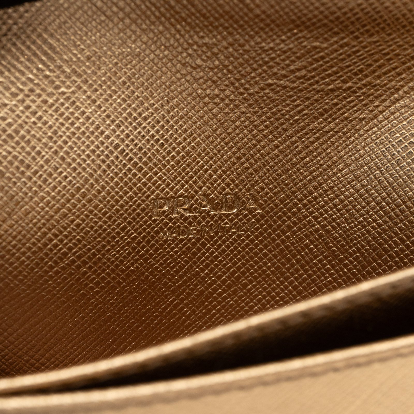 A Metal Saffiano Wallet from Prada. This everyday accessory is made with gold mental color saffiano shine leather and gold-tone hardware. Opens to matching gold leather with an independent card holder and two patch pockets, perfect for organizing small items, providing both style and practicality.