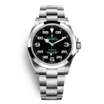 WITH ITS 40 MM CASE IN OYSTERSTEEL, SOLID-LINK OYSTER BRACELET, AND DISTINCTIVE BLACK DIAL, THE AIR-KING PERPETUATES THE AERONAUTICAL HERITAGE OF THE ORIGINAL ROLEX OYSTER.