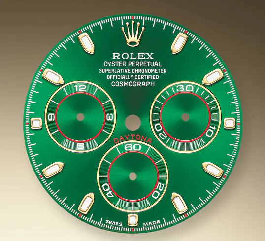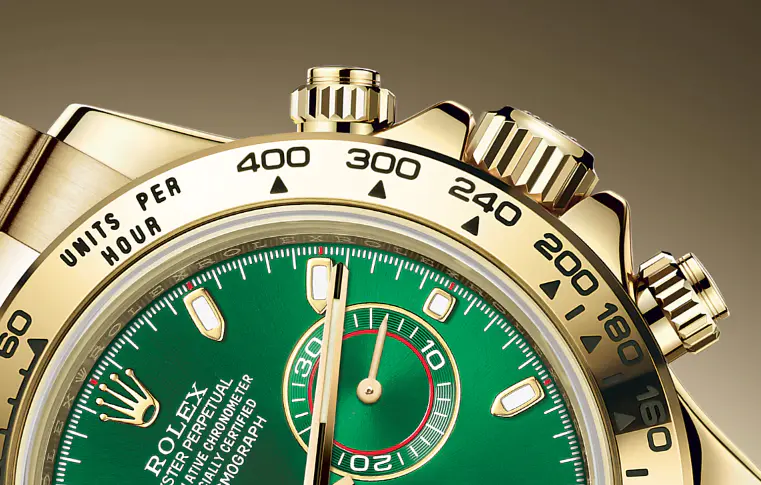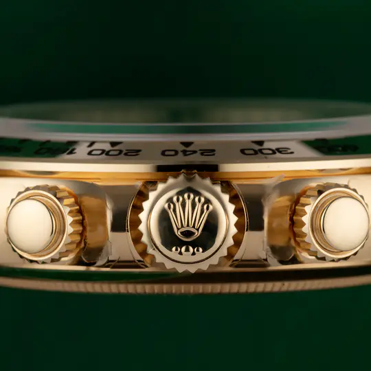 The Daytona’s chronograph feature functions are activated by pushers that screw down like the winding crown when they are not in use, guaranteeing waterproofness to 100 metres. One press to start, stop or reset the chronograph produces a crisp, clear click that was perfected using the most advanced technology. Rolex watchmakers also perfected the mechanism to suit the ideal finger pressure on the pushers, and engineered it to provide an instantaneous and accurate start to the timing without sacrificing reliability.