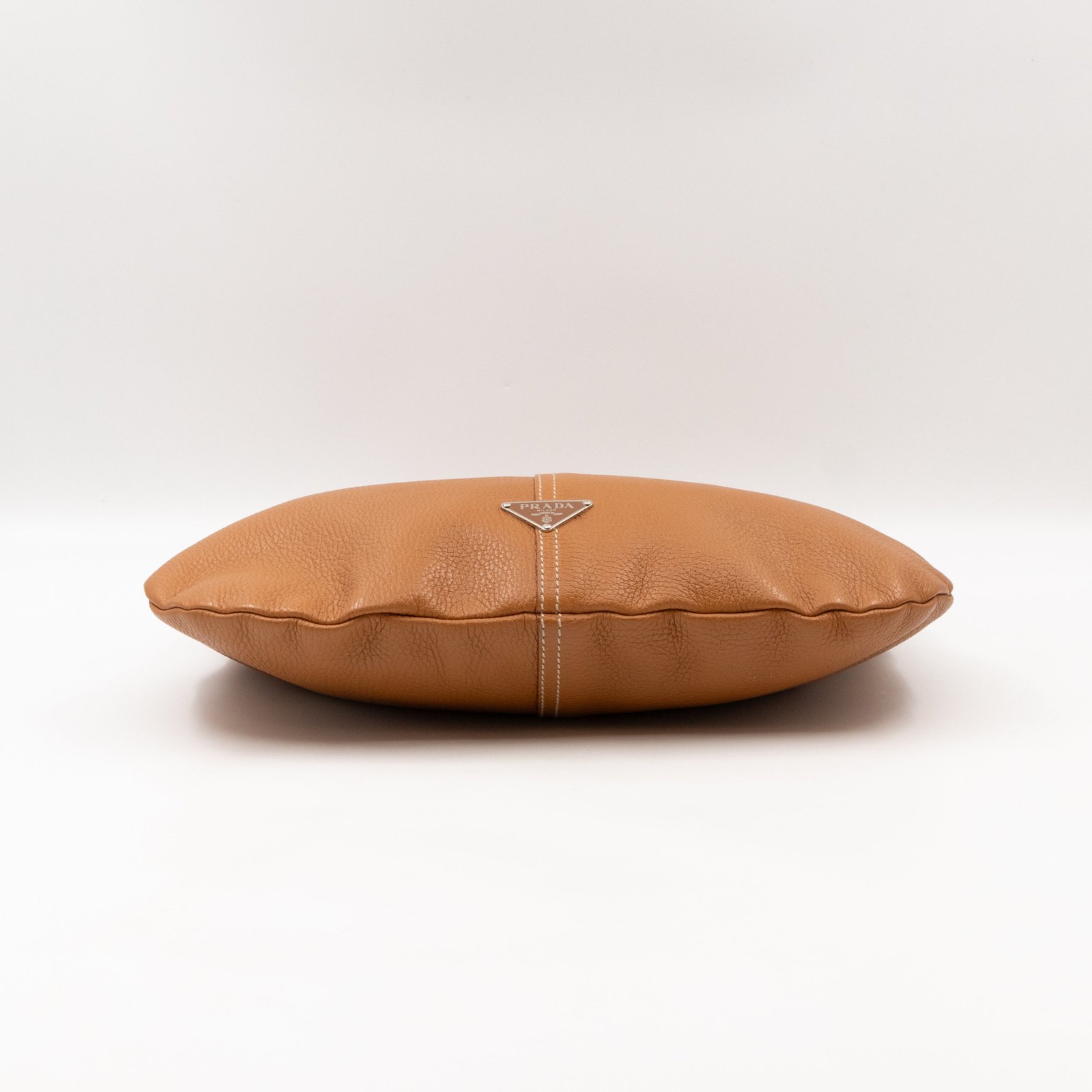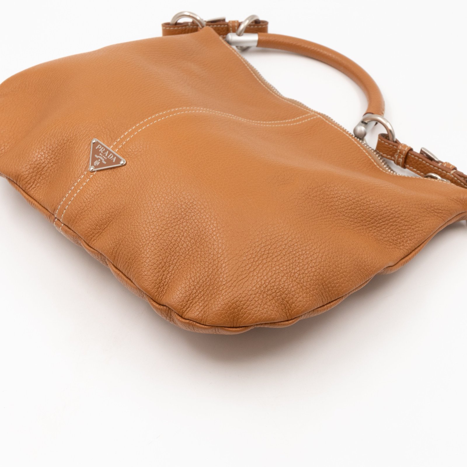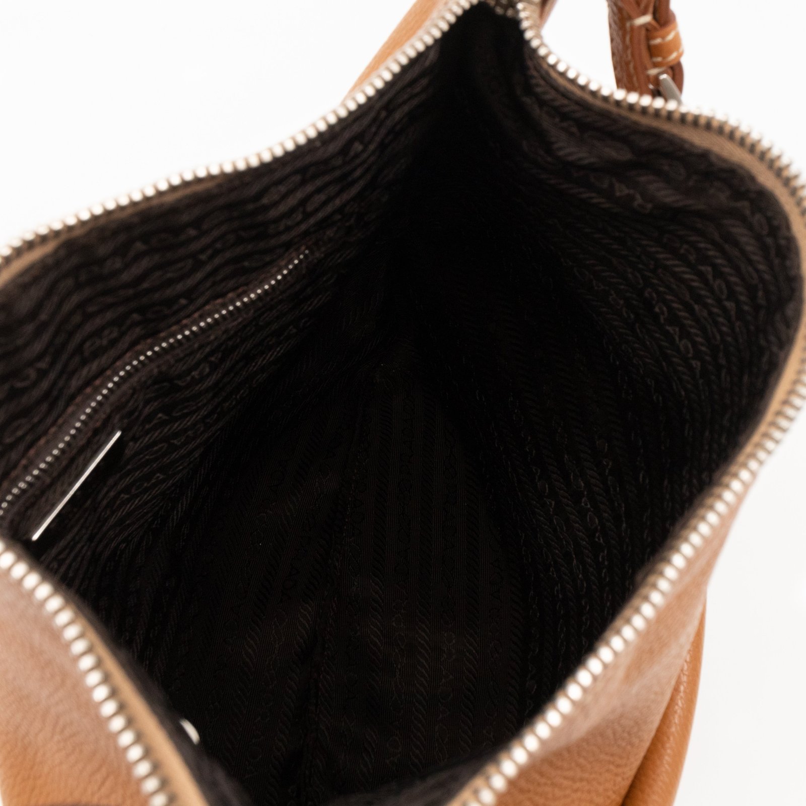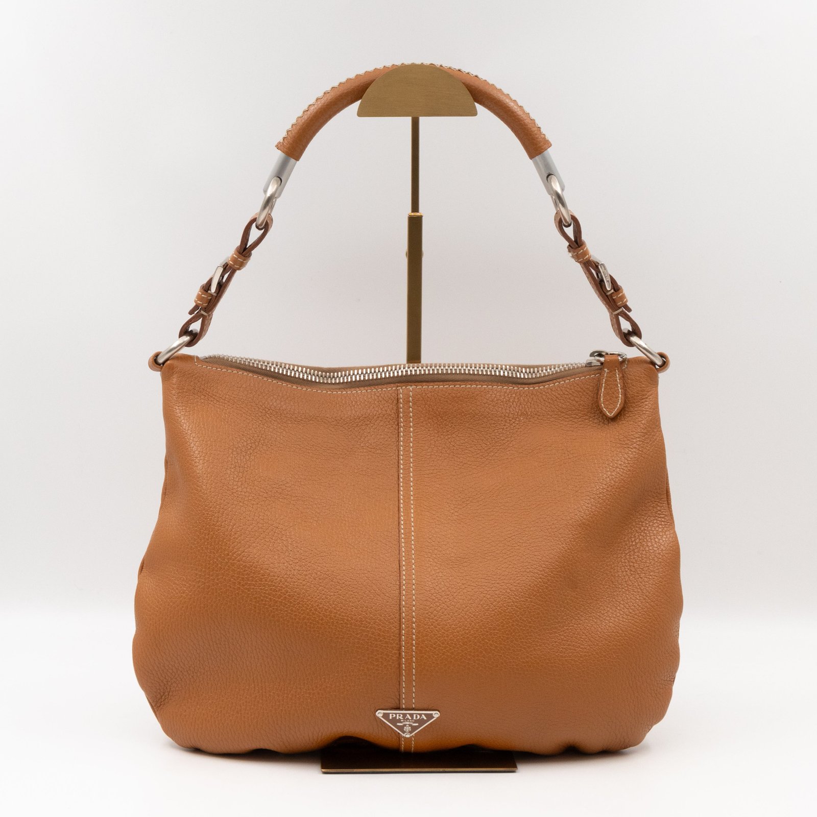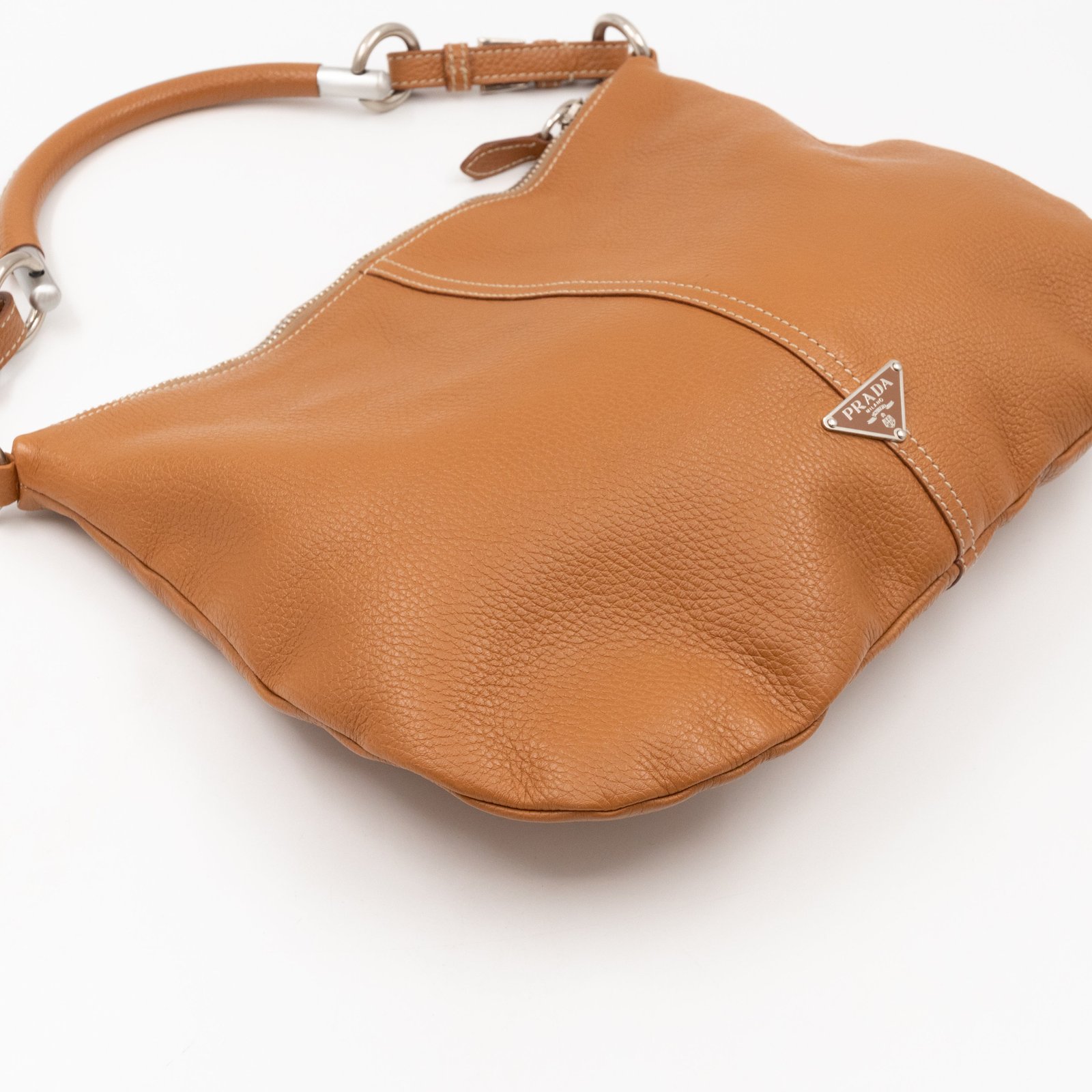 This is a pretty Prada shoulder bag. Very convenient shoulder bag in a brown leather, combined with silver-tone hardware. Top zipper open to a zipper pocket. Great choice for daily use.