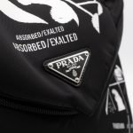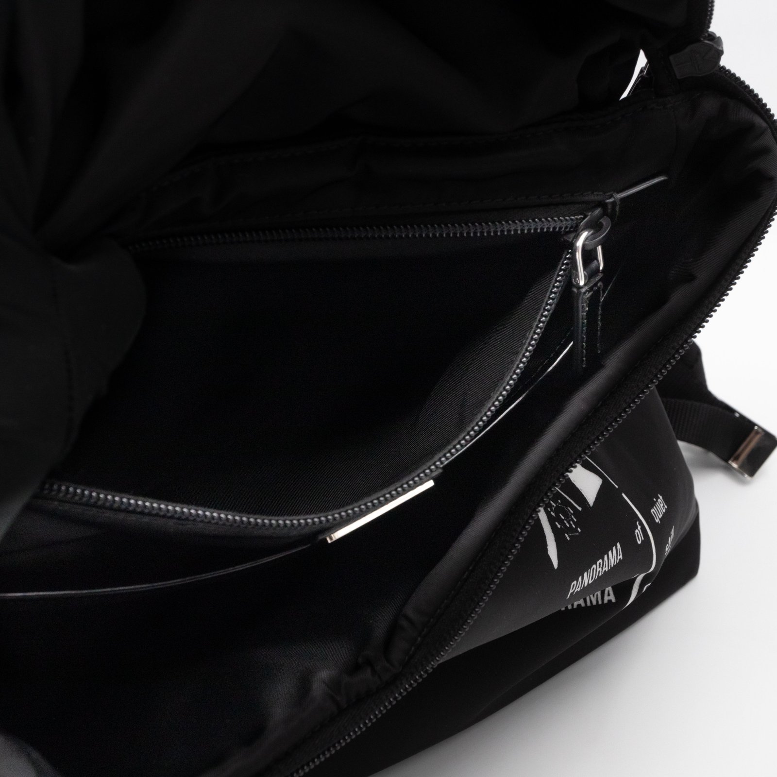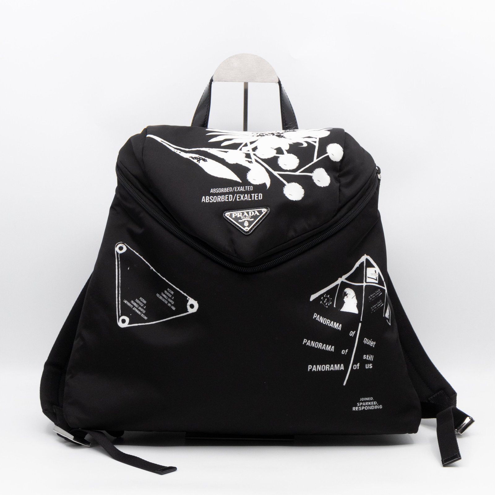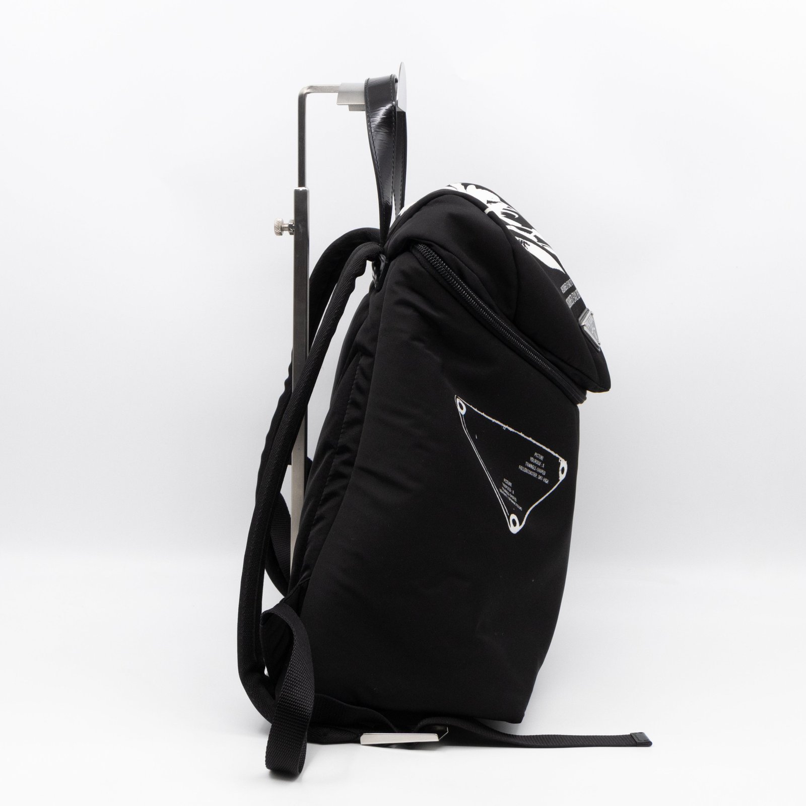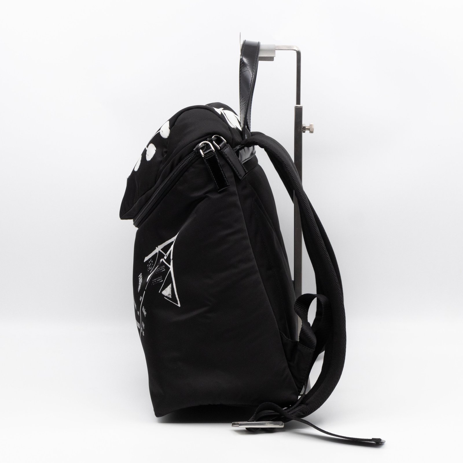 Iconic black nylon backpack in the spring/summer 2021 collection from Prada. Made in black nylon with black leather trims and silver-tone hardware. They are born by the collaboration between the iconic Italian brand and Peter de Potter, a famous Belgian artist. The quilted straps are foam-backed for a comfortable carry. The backpack features a zipper closure, a front flap with the iconic triangle logo and two internal pockets, one with zipper. Comfortable and very practical, great choice for daily use. Retail price is around €1600.