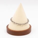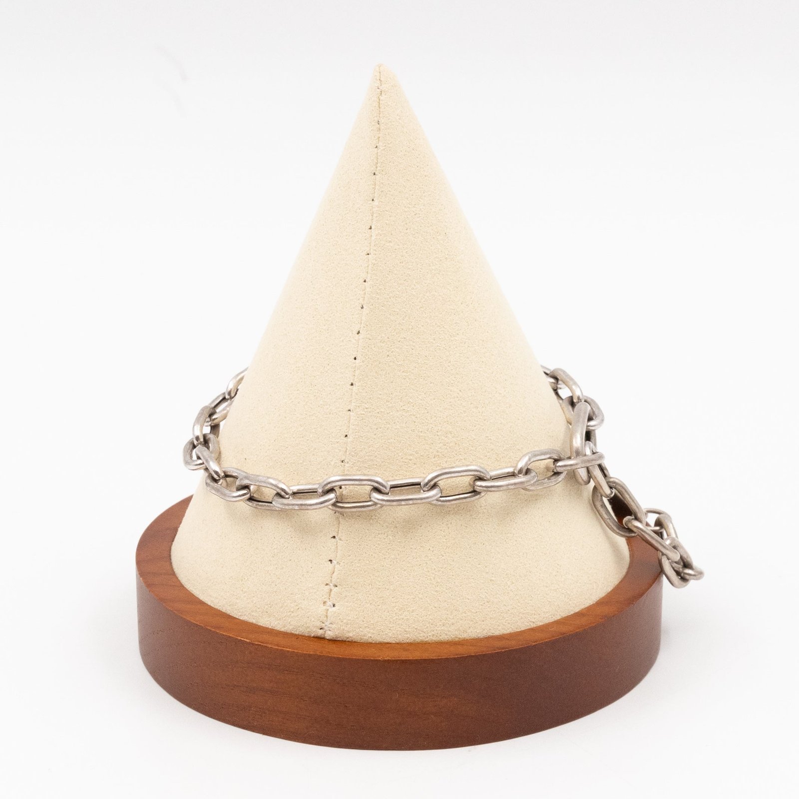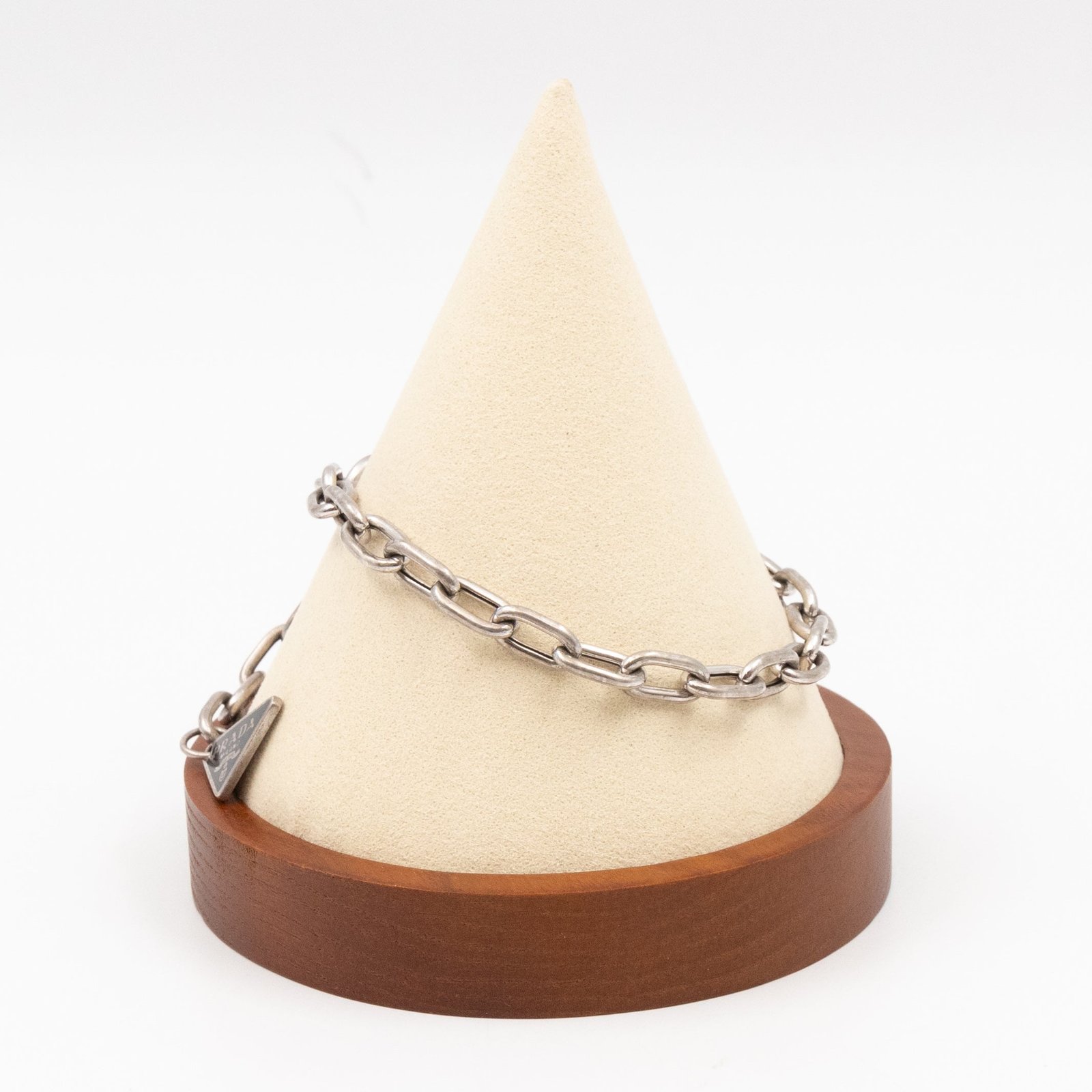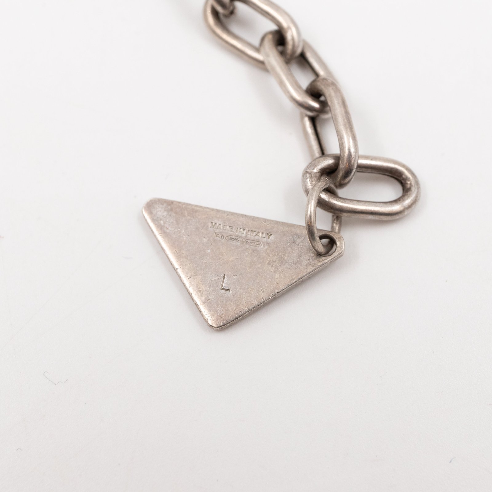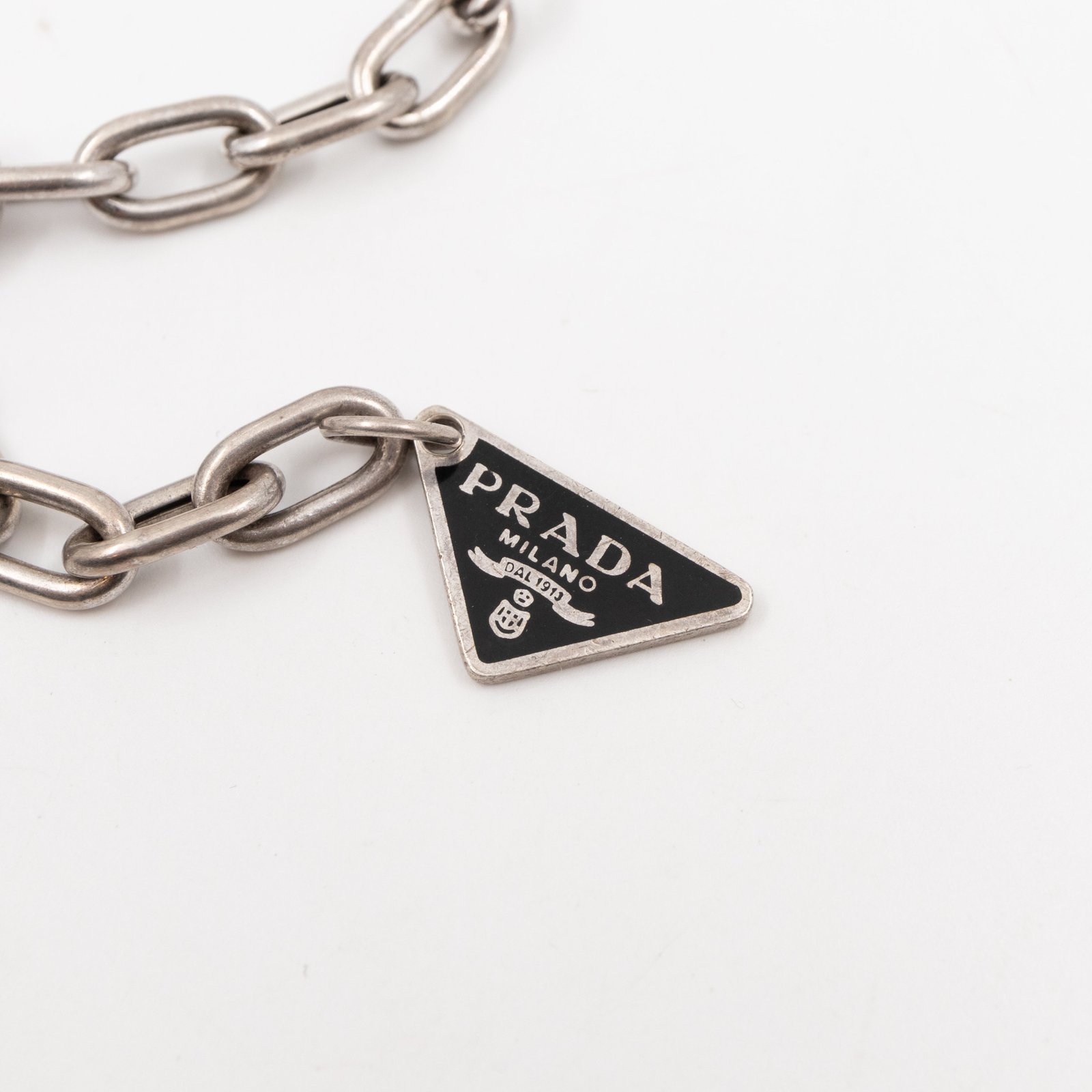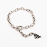 This is a very rare Prada triangle charm logo bracelet. Made in 925 silver and black enamel on the triangle. With a minimalist design, this bracelet adds a touch of luxury and sophistication to any outfit. Total wearable length is 24 cm. Retail price $850.